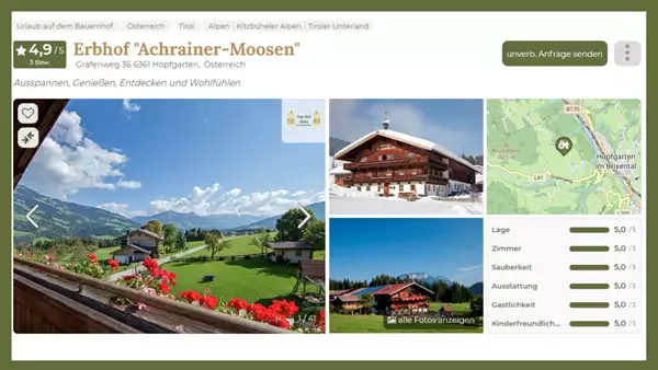 Naše strani s podrobnostmi so popolnoma prenovljene! Zdaj si lahko na prvi pogled ogledate prednosti kmetij, vključno z impresivnimi slikami, ocenami in jasnim gumbom za »Pošlji nezavezujoče povpraševanje« . Ta novi pogled vam pomaga hitro in enostavno najti popolno počitniško kmetijo.